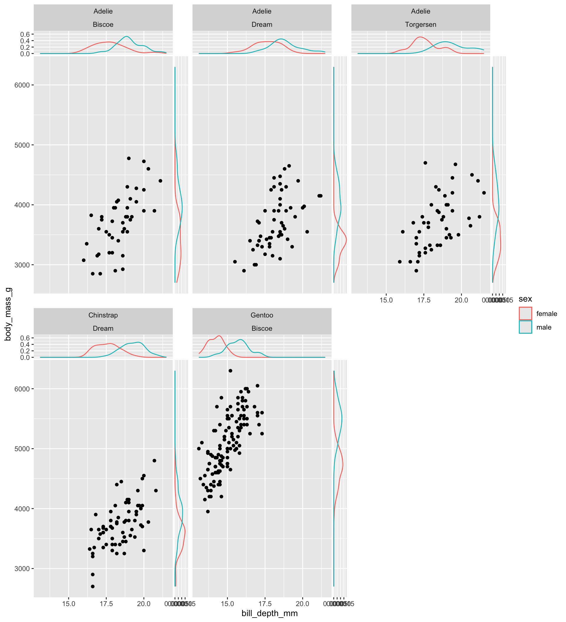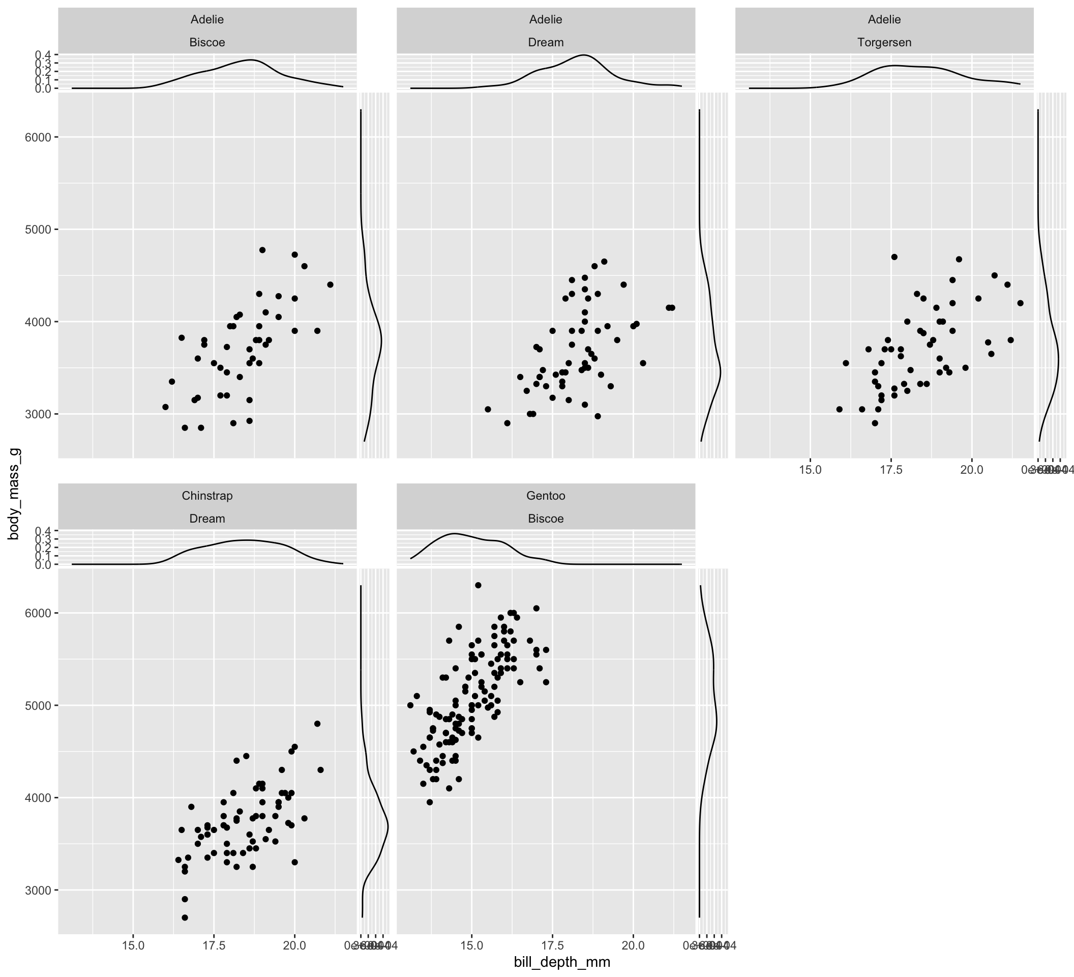 Finally, the set of geom_xside* and geom_yside* functions can be used also in case of panel plots obtained exploiting facet_wrap and facet_grid. Here is a simple example using facet_wrap for subsetting data according to the levels of the variables species and island and adding conditional densities at the two side of scatterplot of bill_depth_mm and body_mass_g: