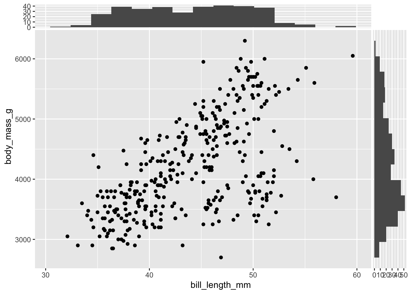 Two histograms can be added to the previous scatterplot exploiting the functions geom_xsidehistogram and geom_ysidehistogram (the bins argument is the same of geom_histogram for setting the number of bins):